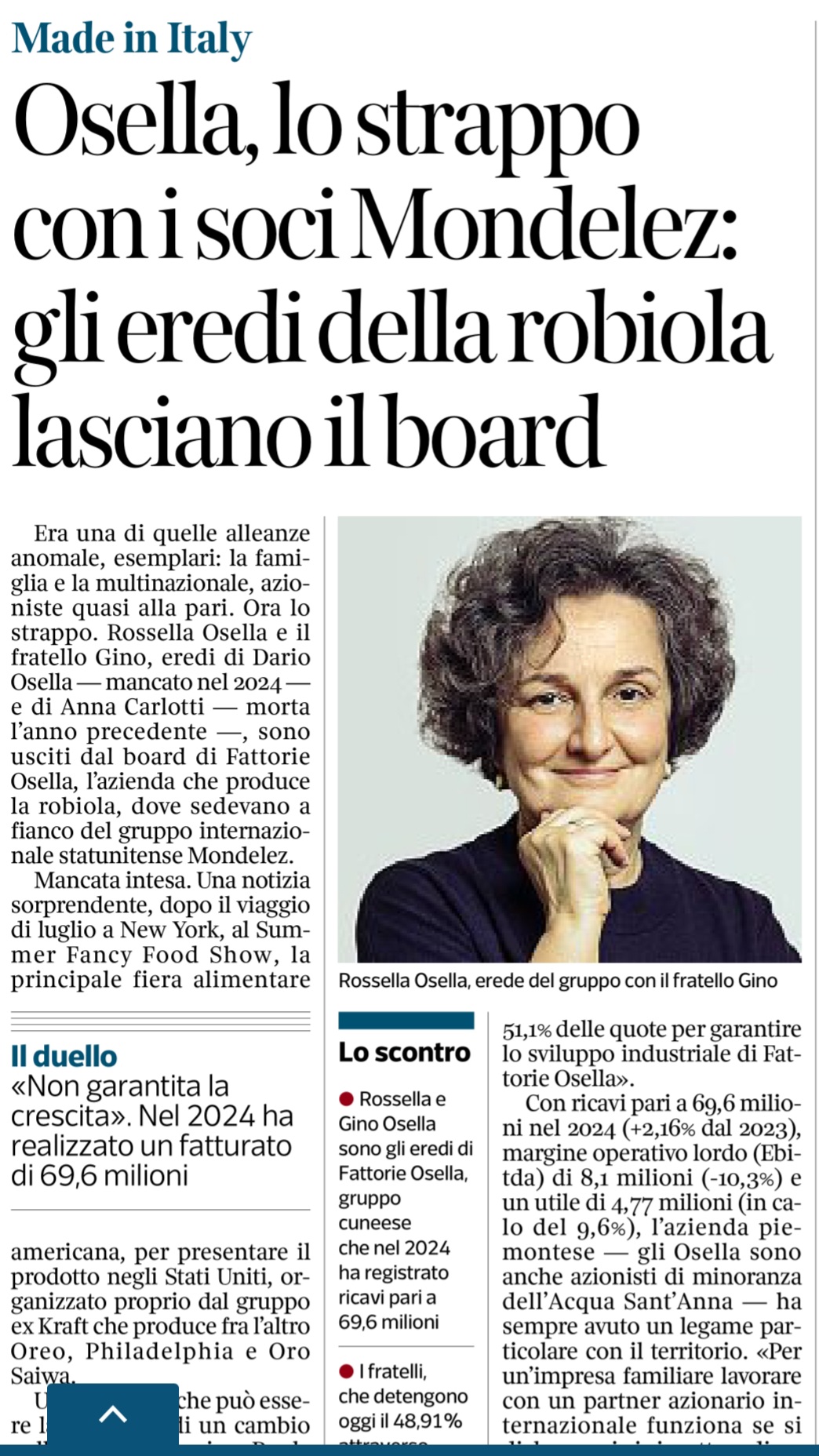 Si sa che la famiglia decise di cedere la maggioranza, mantenendo la propria presenza fondamentale per la gestione, per “garantire lo sviluppo industriale di Fattorie Osella” e questo è molto chiaro, sul lato distributivo del prodotto e sulle tecnologie e “porte” che Mondelez consente di aprire.