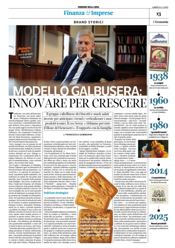 In una recente intervista su Il Corriere Economia il CEO di Galbusera Roberto Serra racconta le strategie del gruppo alimentare di biscotti e snack salati, snocciolando i temi caldi, quali la crescita esterna con l’acquisizione di Tre Marie, il salto di dimensioni conseguente, la distribuzione degli impianti e la loro saturazione, la scelta strategica di aver selezionato solo grani italiani, provenienti da Piemonte, Lombardia ed Emilia.