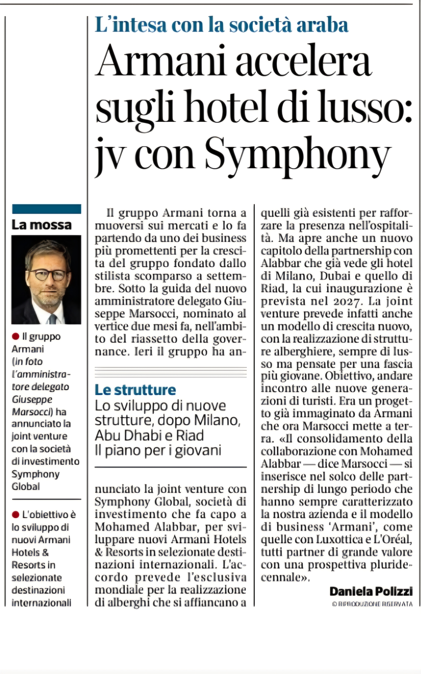 La partnership internazionale di Armani Hotels & Resorts con il partner Synphony global è mirata, ci dice il CEO di Armani, Giuseppe Marsacci in un’intervista al Corriere della Sera, a crescere nella nicchia del lusso studiando un format di lusso sì, ma dedicato ai giovani.