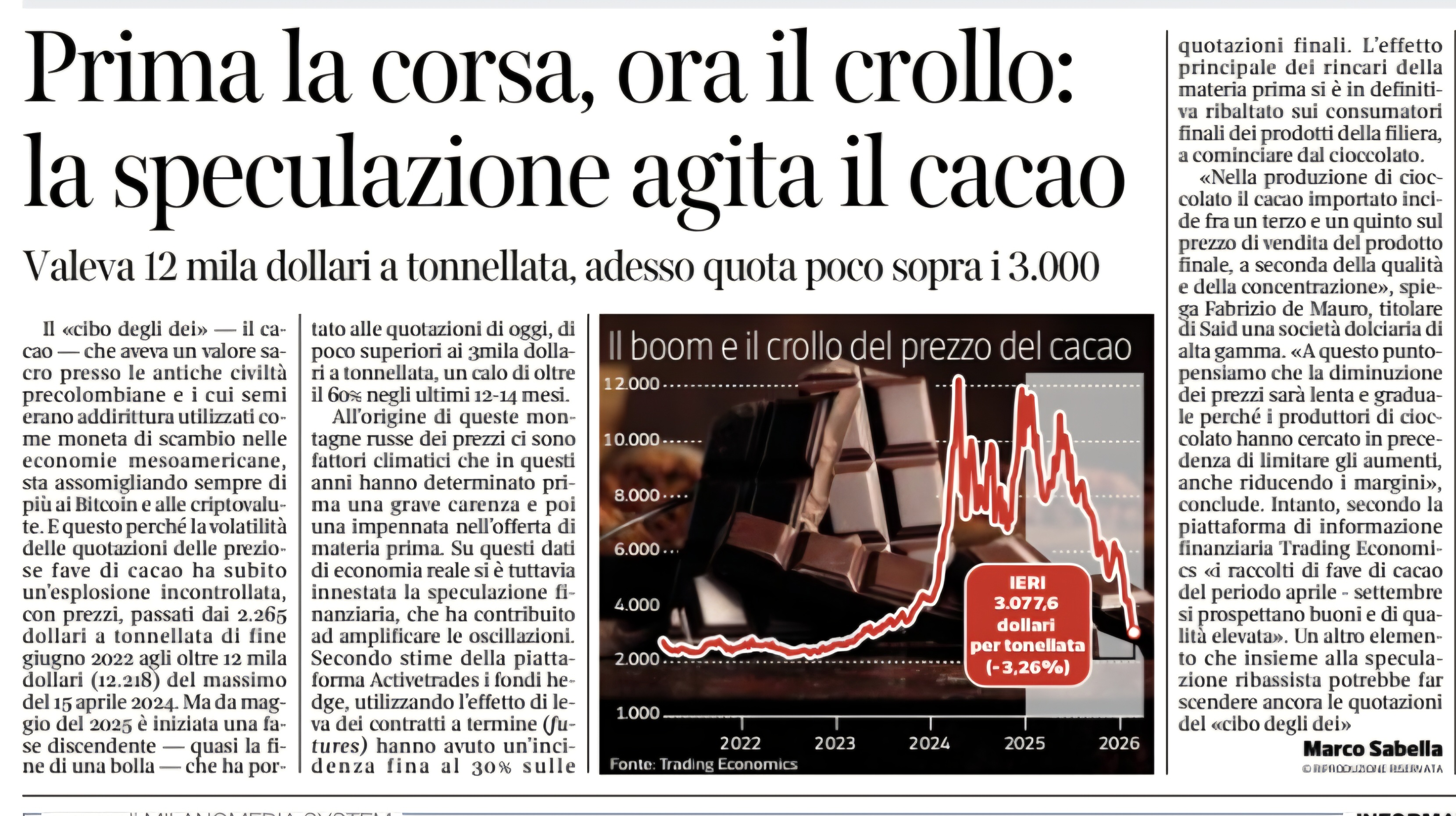 In questi giorni stiamo assistendo alla clamorosa parabola discendente del prezzo del cacao che conclude un percorso di discesa iniziato non molti mesi fa, a metà del 2025.