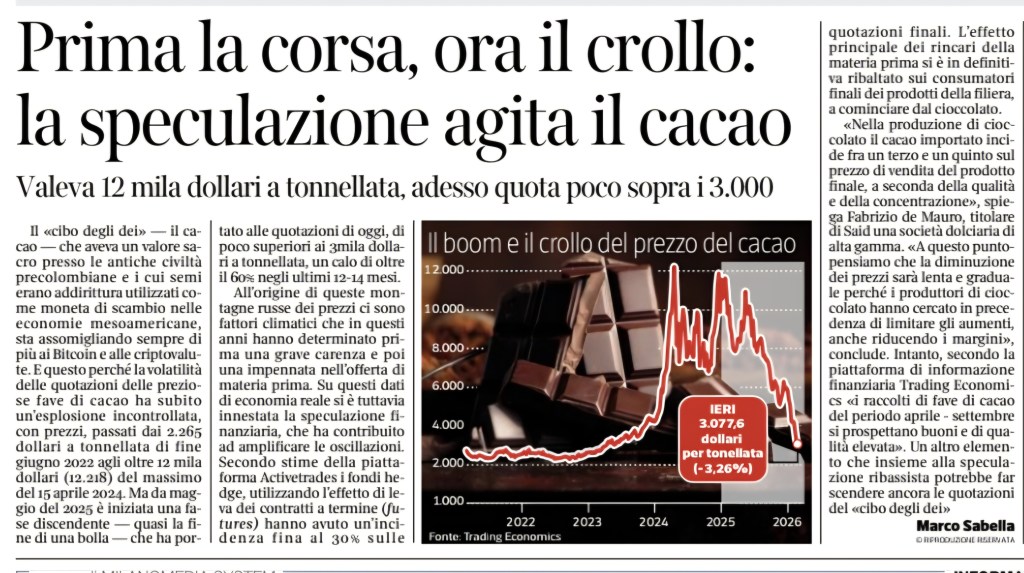 Evidentemente le locuste non ci sono più, i noli, è vero, sono crollati, ma era così anche nel 2025 fin dall’inizio, e così le altre ragioni addotte, il tutto quando il prezzo del cacao era quasi ai massimi. Si sarà già capito quindi che in molti pensiamo che questo caso è da ricondurre a quello delle speculazioni con movimenti creati ad arte per far soldi da parte di tutti, produttori, logistica, chi incassa dazi che sono sul valore, trasformatori, mercati finanziari e dei derivati, distrubuzione. Tutto a spese del consumatore.
